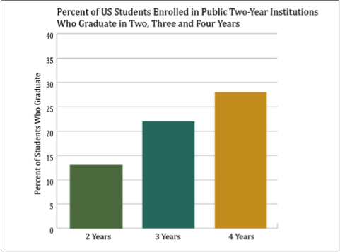 As shown in the graph above, National Center for Education Statistics data shows that only 13 percent of community college students graduate in two years.